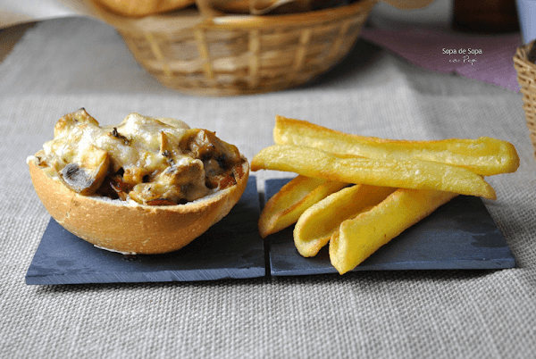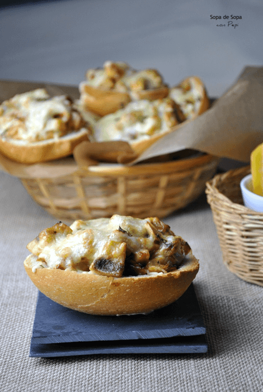 Rellenar las mitades del pan con los champiñones en salsa, cubrirlos con el queso rallado y hornear unos 10-12 minutos.