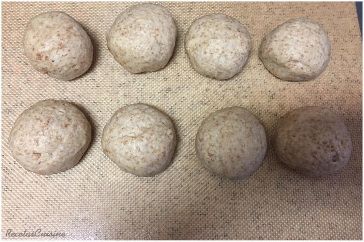 7. A continuación, dividimos la masa en tantas partes como panes queramos hacer. Yo la he dividido en 8 porciones de unos 85gr de peso. Dejamos reposar durante 5 minutos antes de darles la forma.