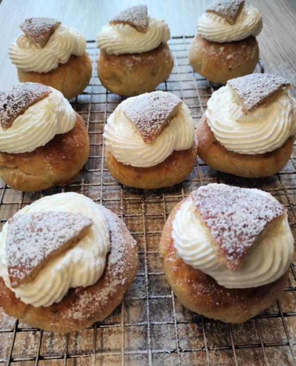 Hola a tod@s, en estos días de Semana Santa que son raros, ya que con los tiempos que estamos viviendo todo es diferente, pero pese a al virus, debemos seguir, no olvidar las tradiciones y la gastronomía típica de esta época en los diferentes países.. en este caso son unos panecillos llamados Semla en singular y Semlor en plural, de Suecia. Investigando un poco, no solamente se comen en Suecia sino también en Dinamarca, Estonia, Finlandia, no me extraña ya que son deliciosos, son una especie de brioche pero un poco más denso, rellenos con mazapán y coronados con nata montada (crema de leche) y azúcar glas. Lleva su tiempo hacerlos, ya que como todos los panes tienes que dejar actuar la levadura, pero el resultado bien vale la pena.Anteriormente se hacía con pan viejo y se hervía en leche, posteriormente se empezó a hornear un bollo dulce de harina que se servía sobre un plato con leche caliente y lo espolvoreaban con canela. Poco a poco, se ha ido convirtiendo en un pastelillo dulce, relleno con pasta de almendras, crema, espolvoreado con azúcar glas y la masa es condimentada con cardamomo. Se puede acompañar con un café u otras bebidas calientes pero tradicionalmente se acompaña con un tazón de leche caliente. A mí me ha encantado, quedan muy bonitos y la combinación de sabores es maravilloso, destacando el sabor a cardamomo recién molido que me fascina.