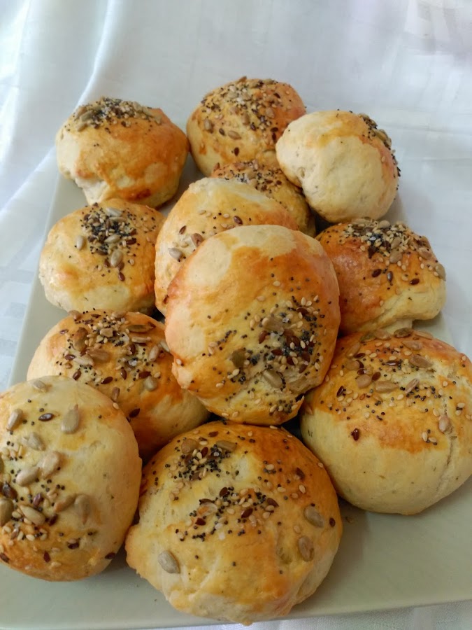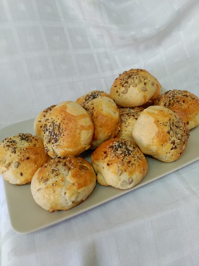 4.- Divida la masa en 12 porciones y deles forma de panecillos (yo los hice redondos pero los puedes hacer alargados tambien). Coloquelos en una bandeja de horno previamente forrada con papel de hornear . Pinte cada panecillo con la yema de huevo y a continuacion espolvoree las semillas y la pizca de sal en escamas o sal gorda. (sal fina NO). Deje reposar en lugar calido y sin corrientes de aire durante unos 30 minutos para que vayan creciendo.