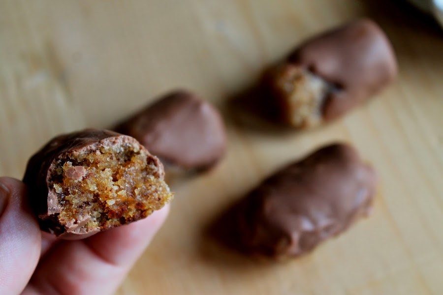 Deshacemos el chocolate, y cubrimos con él los panellets. Dejamos solidificar.