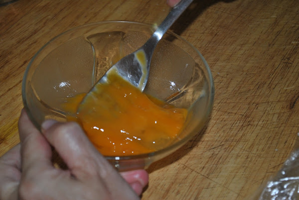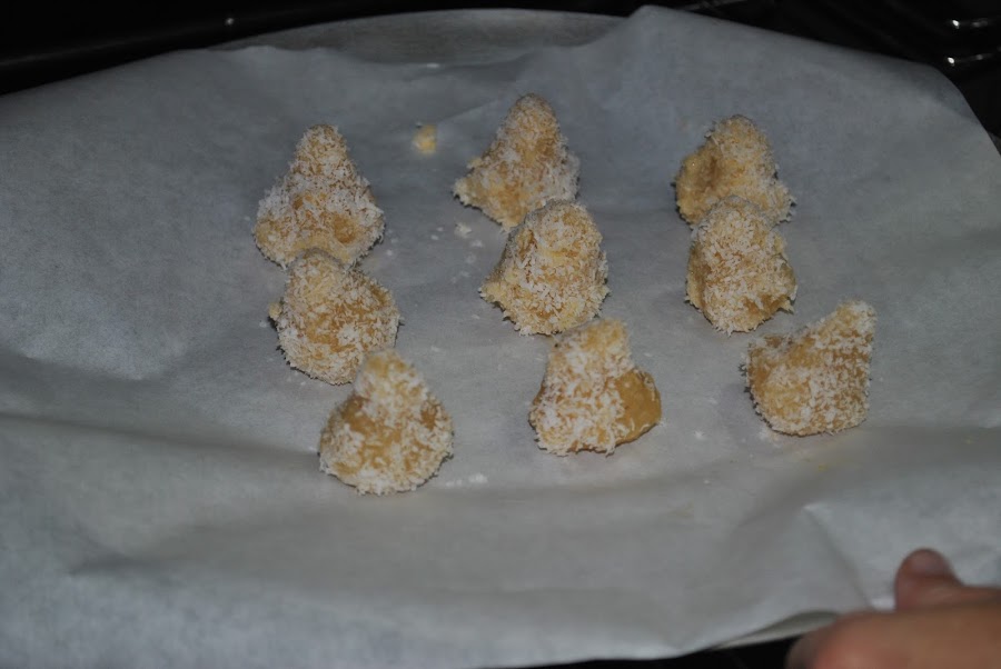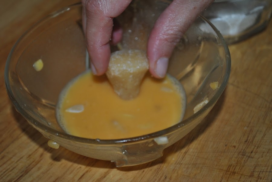 La puntita la mojamos con huevo batido y a continuación pasamos por el coco rallado.