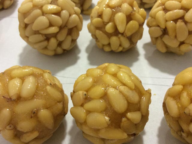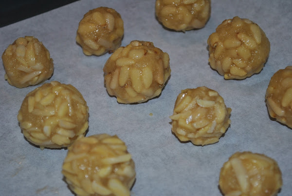 Ahora mojamos nuestras manos en el huevo batido e impregnamos una pequeña cantidad de masa de mazapán en el mismo y cogemos un puñadito de piñones y lo integramos.