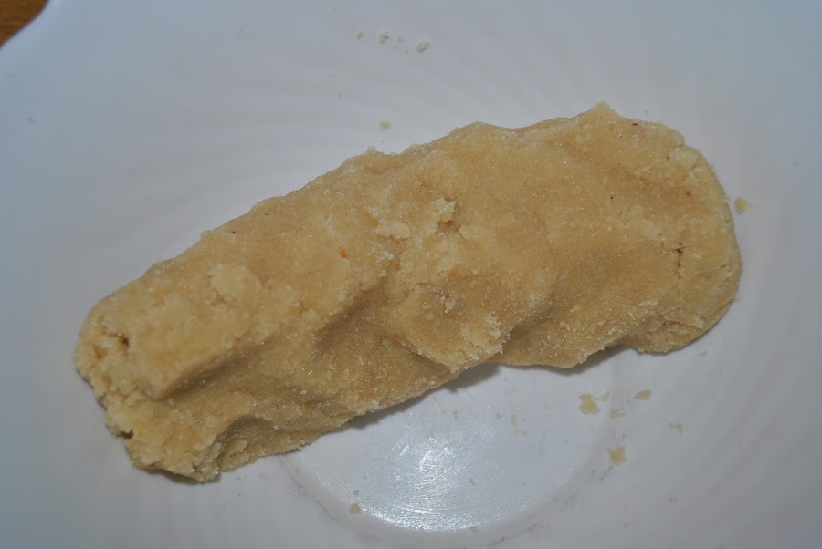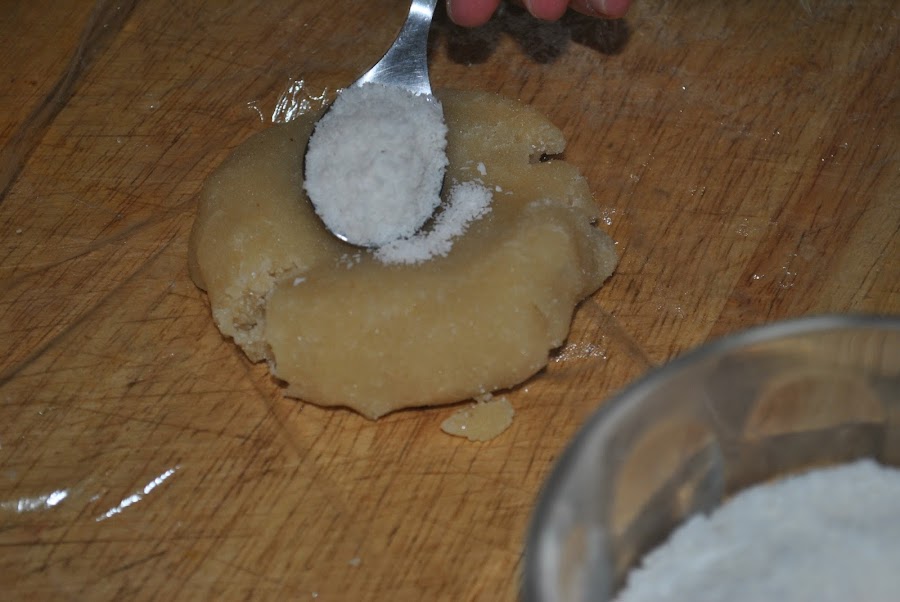 Cogemos la porción de mazapán que utilizaremos para nuestros penellets de coco y haremos una bola que aplastaremos con la mano.