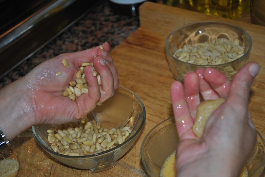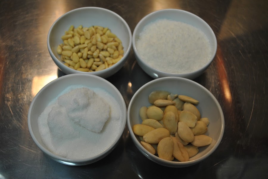 Cuando decidamos hacer nuestros Panellets, sacamos la masa para que coja temperatura ambiente, y mientras preparamos los ingredientes que queramos incorporar a nuestros panellets. Y encendemos el horno a 220º.