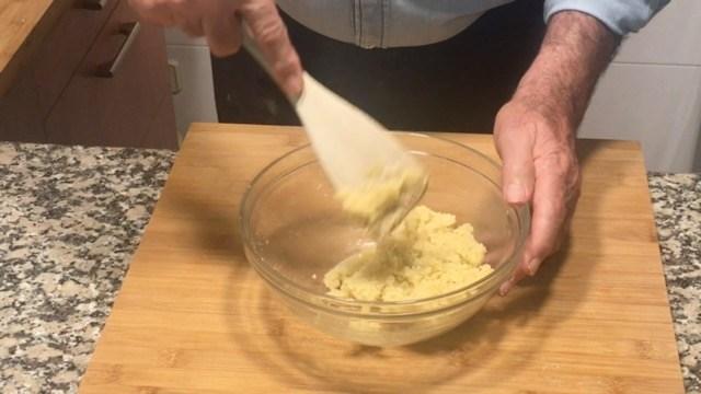 Batiremos el huevo y lo agregaremos poco a poco. Con una espátula de madera lo iremos amasando hasta que esté totalmente integrado.