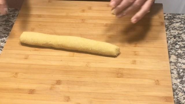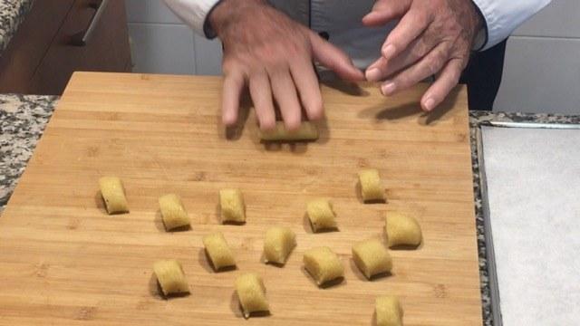 Cortaremos las porciones de un tamaño de 20 gramos aproximadamente y estiraremos un poco cada porción dándole primero una forma alargada y después le daremos forma de media luna.