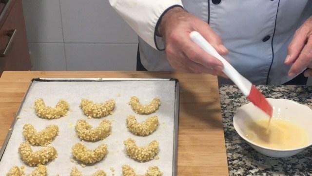 Batiremos dos yemas de huevo. Rebozaremos cada porción con el huevo batido y después con el granillo de almendra.