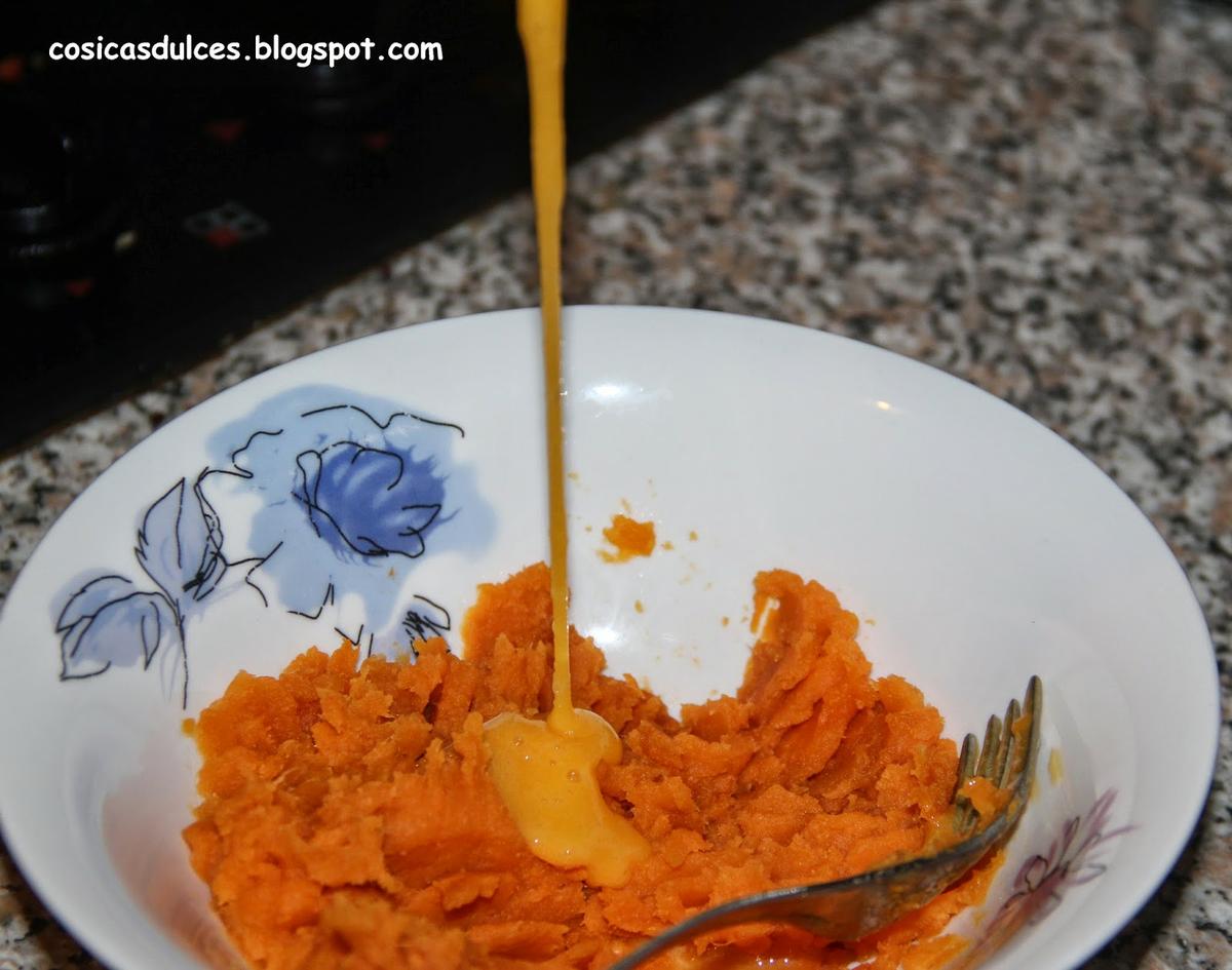 Una vez tengamos el boniato asado, lo aplastamos bien con un tenedor. Le añadimos la yema de huevo batida, mezclamos bien y reservamos.