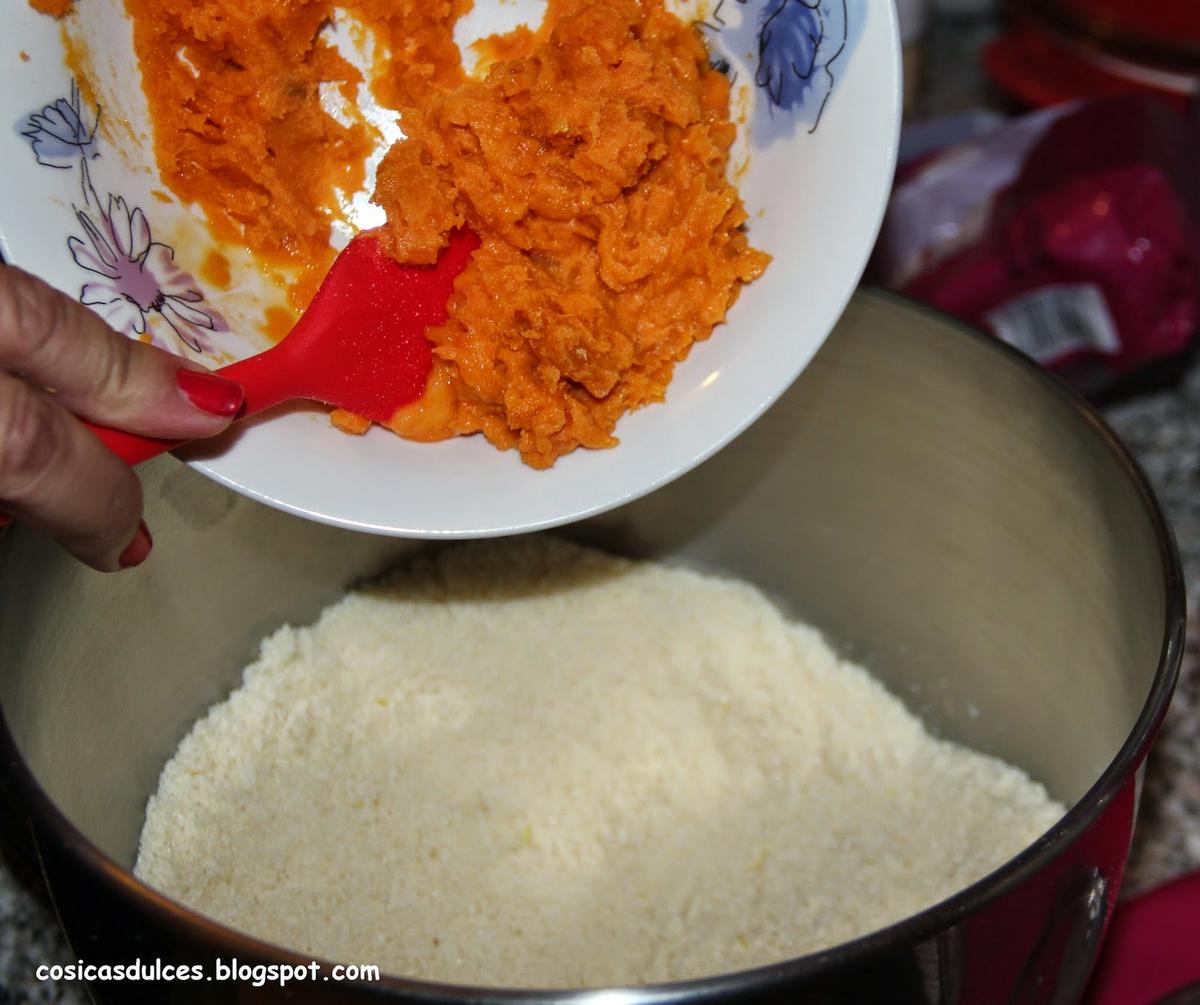 En un bol ponemos la almendra molida, el azúcar y la ralladura de limón y mezclamos. Seguidamente agregamos el boniato que teniamos mezclado con la yema de huevo y amasamos bien. Yo lo hice en la KitchenAid colocando la pala amasadora aunque puede hacerse a mano sin problemas.