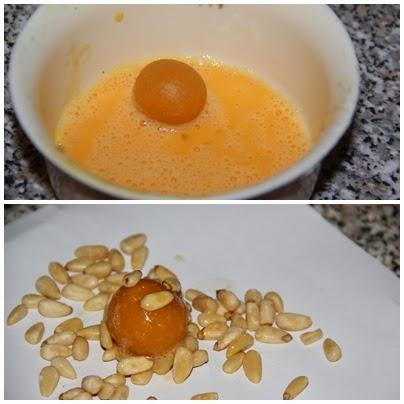 Para hacer los de piñones tomamos porciones de 14 gramos les damos forma redondeada, los bañamos en huevo batido, los rebozamos en piñones y los pincelamos con yema batida antes de hornear.