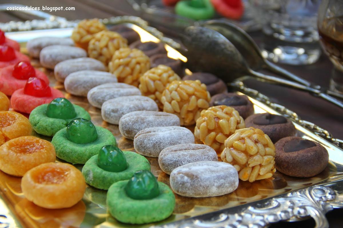 Los de guinda son porciones de 14 gramos de masa teñida sobre la que colocamos la guinda antes de hornear. Para los de naranja hacemos bolitas de 14 gramos con un hueco en medio que rellenamos (antes de hornear) con mermelada de naranja amarga. Una vez listos los horneamos a 200º durante seis minutos. Al salir estarán muy blanditos pero luego endurecen así que no hay que pasarse de ese tiempo.