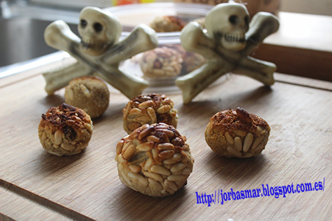 En esta ocasión, os presento un postre típico de la festividad de Todos los Santos, aunque realizado con castañas cocidas en lugar de boniato y con chufas hidratadas en brandy, además de los habituales piñones y la harina de almendras.