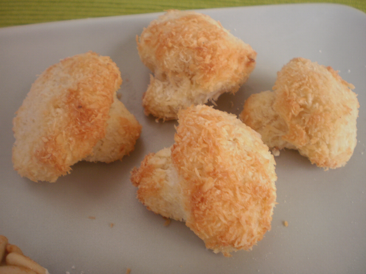 Hacer bolitas con la masa, pasarlas por la clara de huevo y posteriormente rebozarlas en coco.