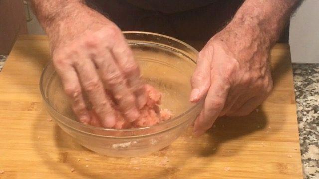 Apretaremos con las manos y amasaremos un poco en el bol. Añadiremos medio huevo batido y amasaremos un poco más en la mesa de trabajo para que la almendra acabe de soltar su aceite.