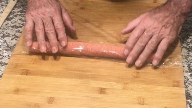 Haremos una bola y seguidamente le daremos forma de cilindro bien alargada. Taparemos con papel film y guardaremos el mazapán en el frigorífico durante unas 12 horas.