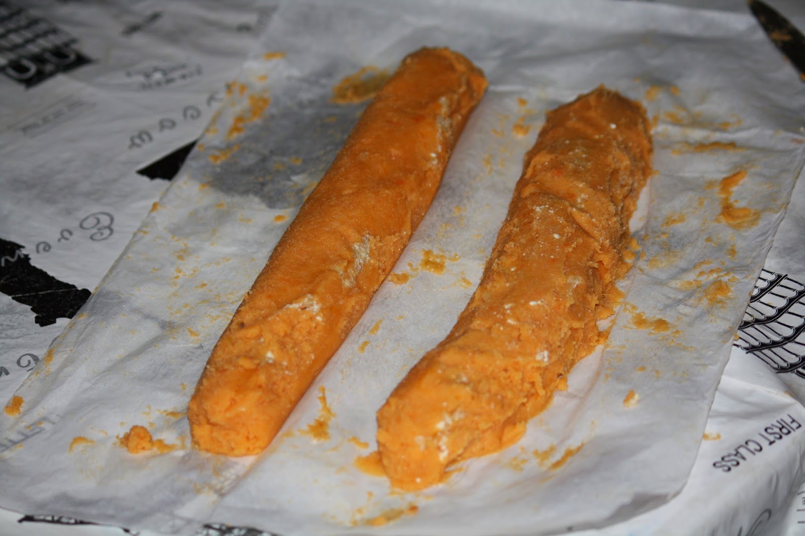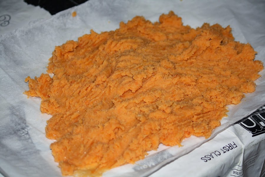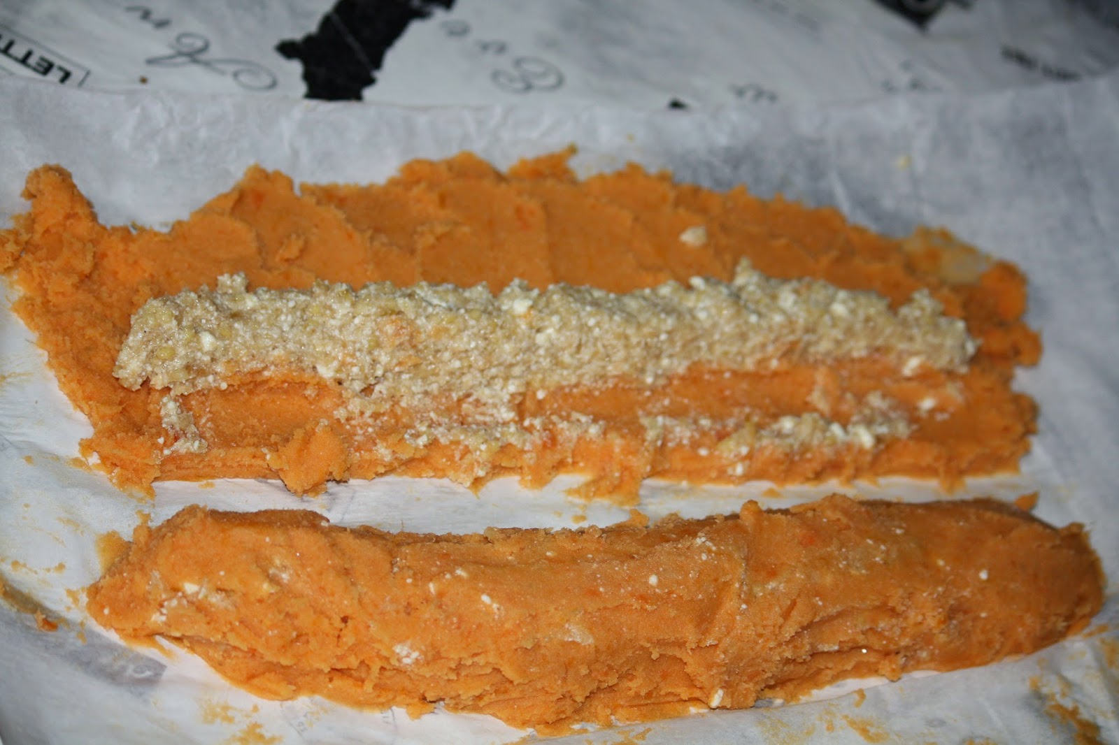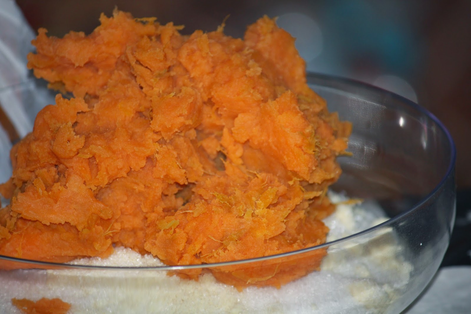 Pelar y mezclar el boniato con las almendras y el azúcar, amasando hasta obtener una mezcla homogénea.
