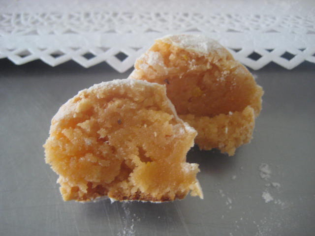 Panellets de naranja: Añadir a la masa del mazapán una cucharada de zumo de naranja, una de corteza de naranja muy fina y una pizca de colorante naranja, pesar porciones de 20 gr. de formar bolitas, pasar por azúcar glas y colocar en una bandeja de horno.