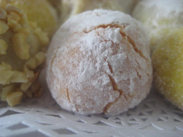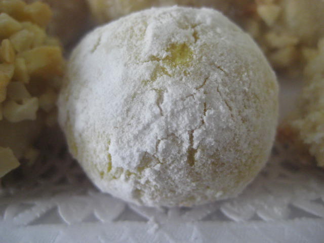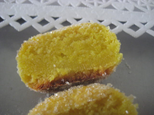 Panellets de limón . Añadir a la masa del mazapán abundante corteza de limón muy finamente rallada y un poco de colorante amarillo, pesar porciones de 20 gr. formar bolitas y pasar la mitad de ellas por azúcar y la otra mitad por azúcar granillo (la normal). Colocar en una bandeja de horno.