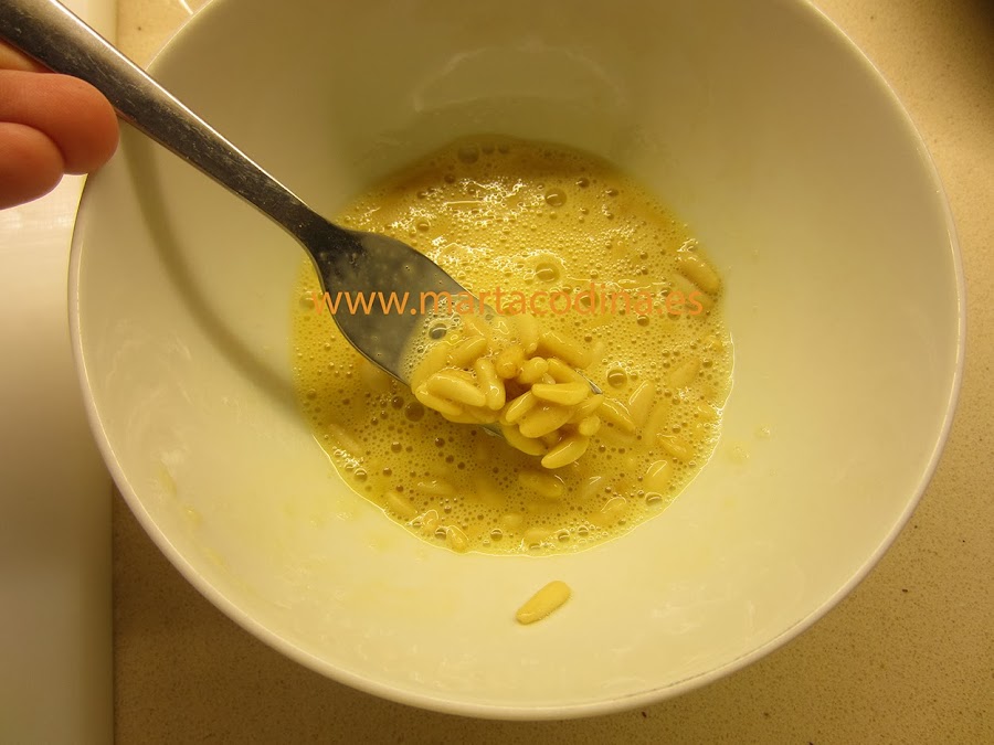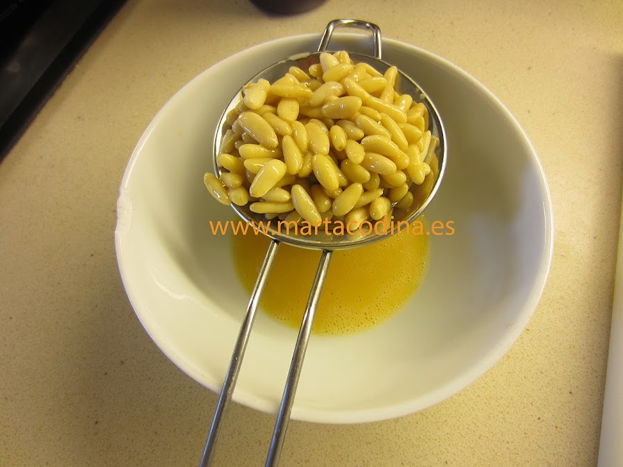 Hornear a 200ºC unos 4-5 minutos, hasta que los piñones empiecen a dorarse.