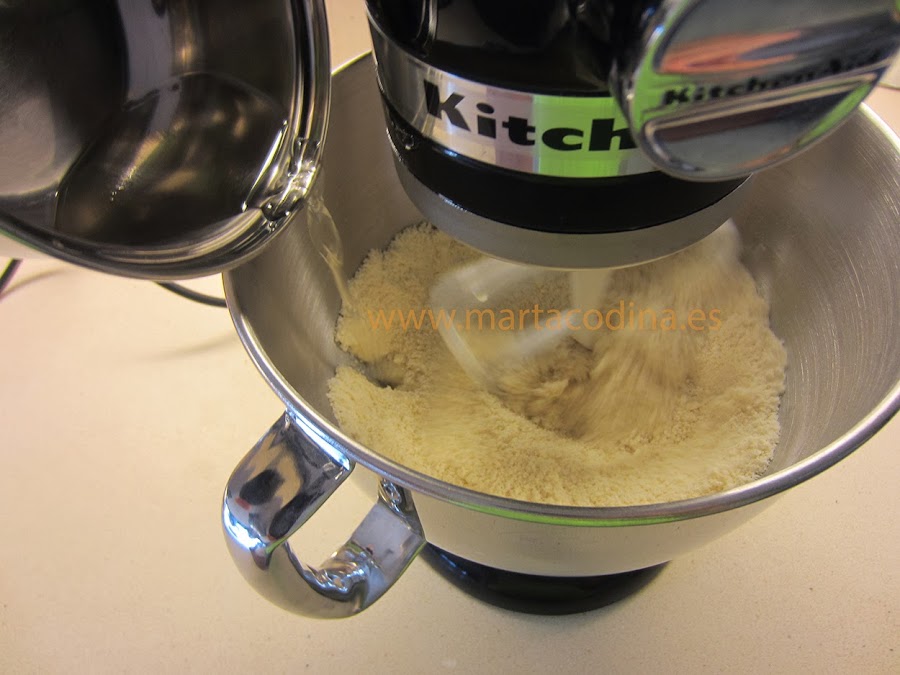 Entibiar el agua y el azúcar invertido, incorporar a la preparación anterior.El azúcar invertido, también llamado trimolina, mantiene la humedad del mazapánSi no disponemos de azúcar invertido, utilizaremos unos 100 g de azúcar normal.