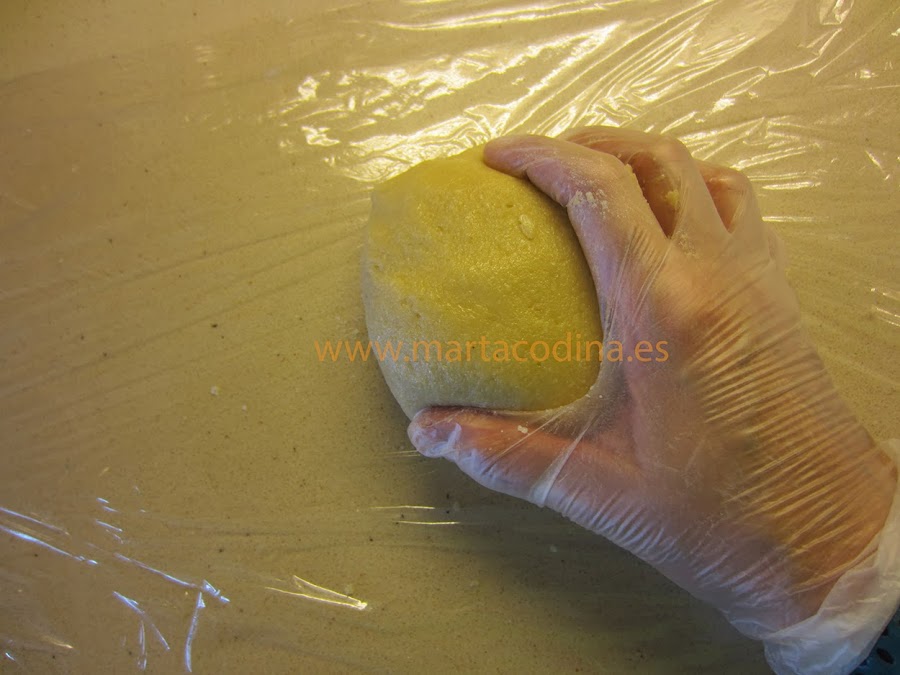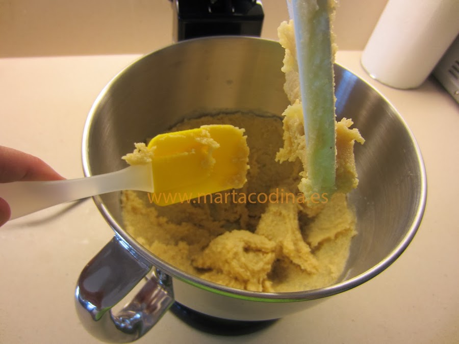 El peso de las claras es estimado. La textura final debe ser una masa mas o menos compacta que nos permita moldearla, tiene que quedar tierna pero no pegajosa.