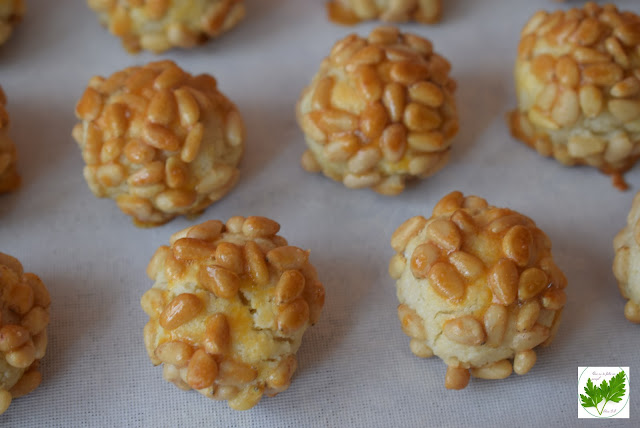 Precalienta el horno a 200º. Forma bolitas del tamaño de una nuez, pásalas por clara de huevo batida, reboza en piñones y pinta con la yema de huevo batida también. Pon las bolitas en una bandeja de horno sobre papel de hornear. Hornea hasta que estén dorados los piñones.