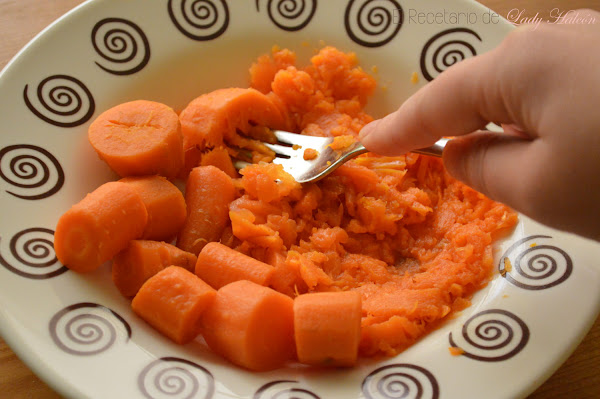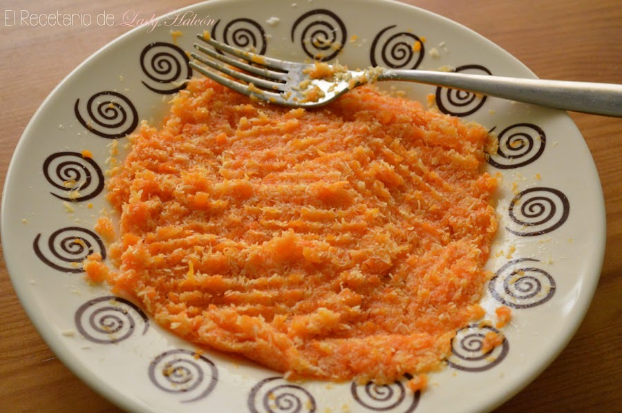Cuando las zanahorias ya se hayan enfriado cháfalas con la ayuda de un tenedor o una trituradora si no lo quieres hacer a mano.