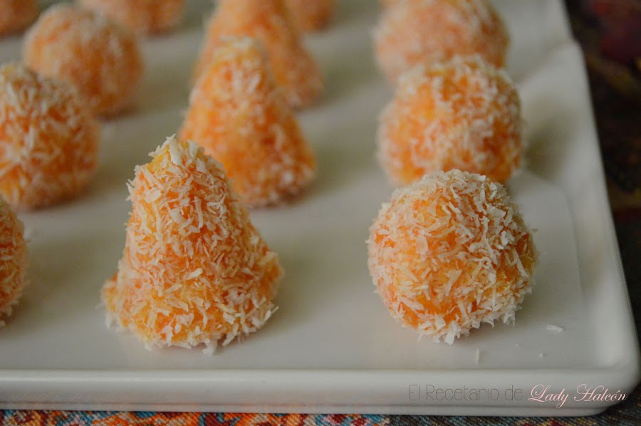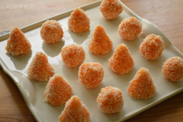 Y ya solo nos queda coger un poco de masa y darle forma con las manos. Los puedes hacer más o menos grandes según te guste y con forma redonda o de cono. Yo opté por hacerlos en un tamaño bocado y combinando las dos formas. Una vez que tenga la forma deseada, puedes cubrirlo con un poco de coco.