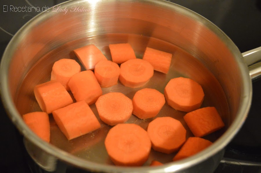 Lava, pela y corta en trozos las zanahorias. Colócalas en un cazo con agua y cuécelas hasta que estén blandas.