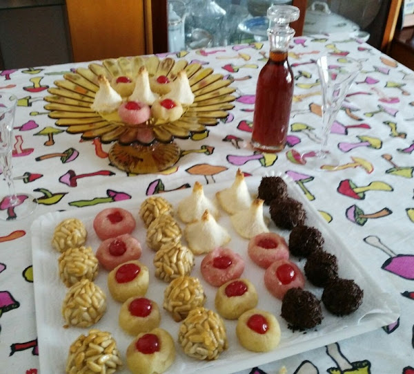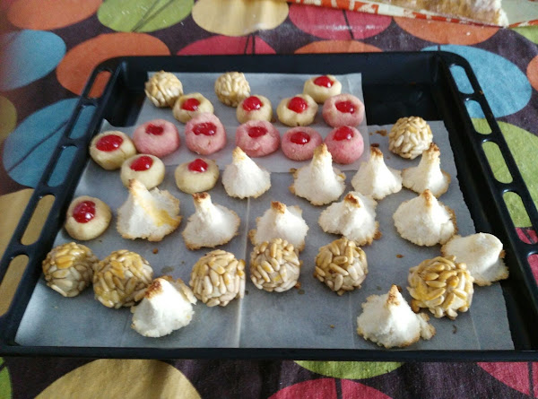 Masa de patata, almendra y azúcar. Hacer bolas y aplastar, con el dedo hacer un hueco ligeramente y poner una cereza confitada.
