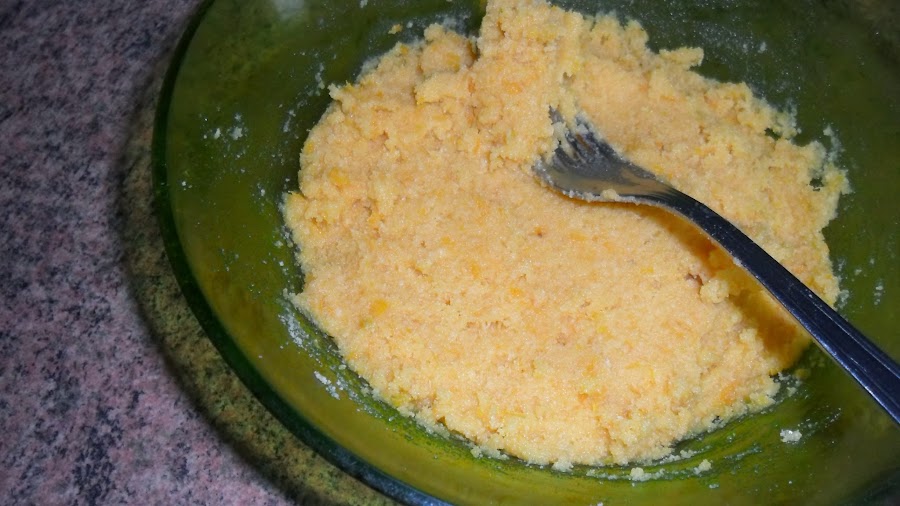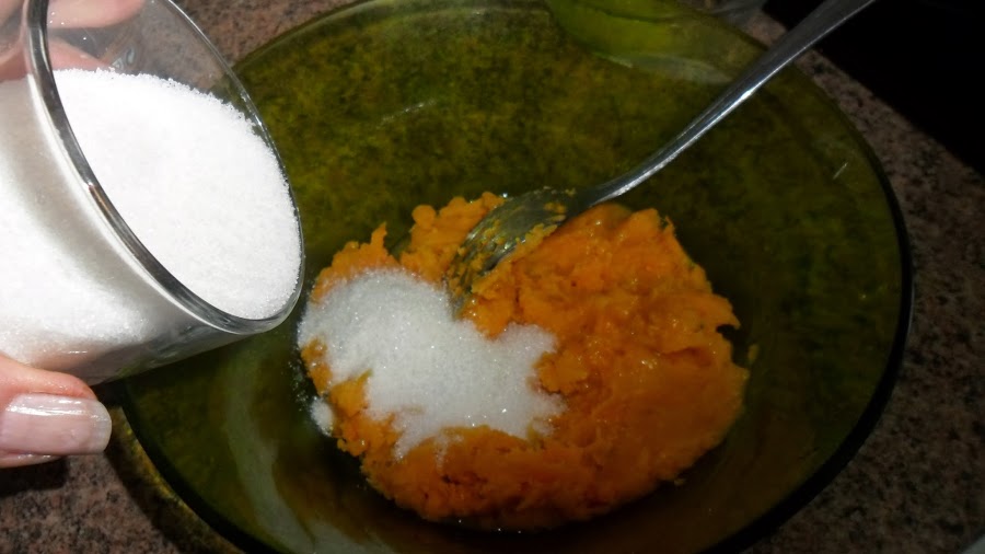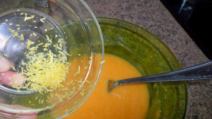 Por otro lado, separar las yemas de huevo de las claras y mezclar con el boniato, agregar el azúcar ralladura del medio limón y mezclar muy bien.