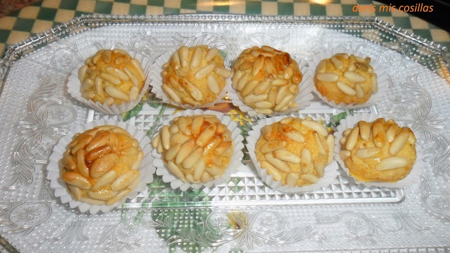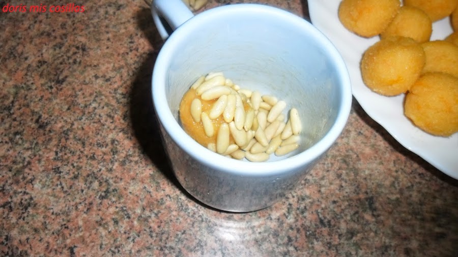 Acto seguido, poner en una pequeña tacita piñones y rebozamos los pasttiset sacudiéndola y tapando con la mano, de esa forma lo hacemos también con la almendra gravilla y con las pipas de girasol o con lo que mas nos guste.
