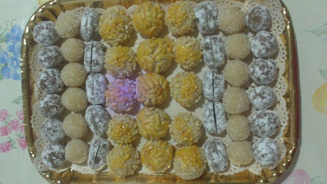 Para los de piñones y almendra, hacemos las bolitas, las pasamos por la clara de huevo y los rebozamos por los piñones o almendras.