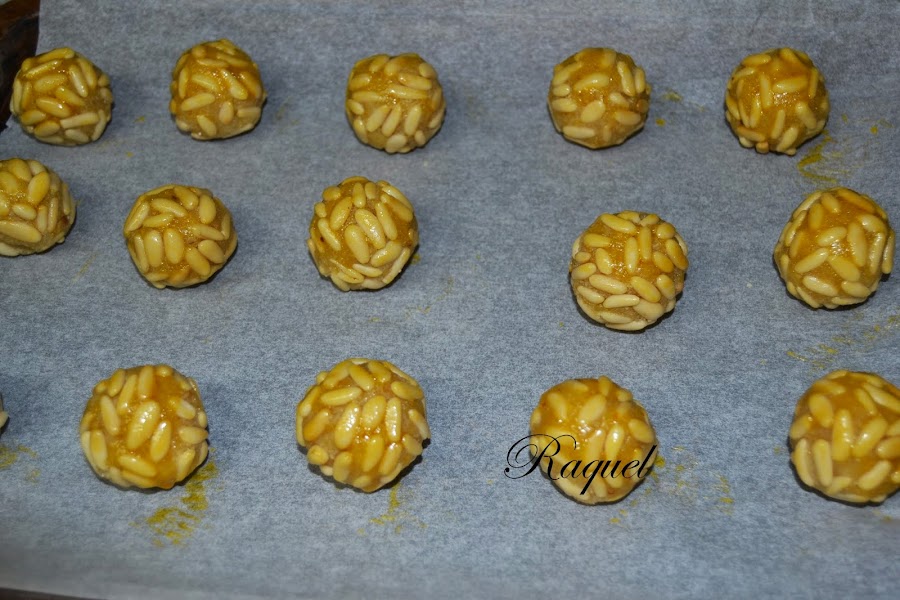 Hacer bolitas, pasar por clara de huevo y rebozar de piñones, pintar por encima con yema de huevo, tengo que decir que estos son los mas laboriosos, ten paciencia si los piñones cuestan de poner, porque vale la pena luego son los que mas gustan.