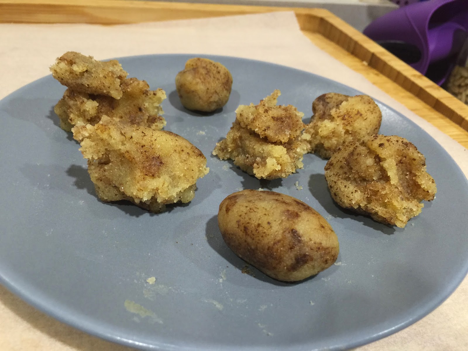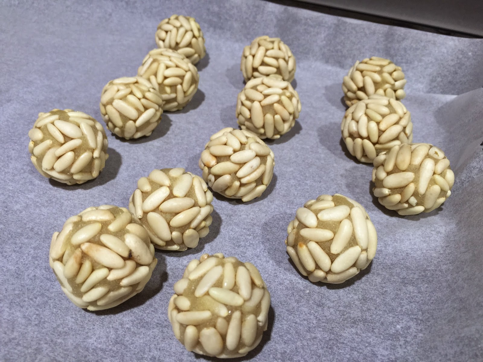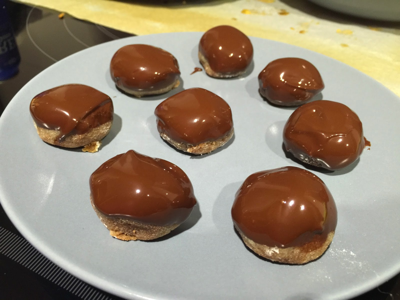7. Para los de chocolate, cogemos una porción de 125g de masa y le añadimos 2 cucharaditas de cacao en polvo sin azúcar. Dividimos la masa en porciones de 17g. Boleamos presionado un poco la base, para que queden algo mas estable de la base. Los colocamos en la bandeja de horno con papel de hornear. Horneamos durante 6 minutos a 200ºC. Al sacarlos del horno parecen muy tiernos y delicados, no os preocupéis, en el momento que enfrían endurecen un poco y toman consistencia. Dejamos enfriar. Cuando hayan enfriado, derretimos el chocolate y bañamos la superficie de los panellets. Dejamos que solidifique el chocolate.