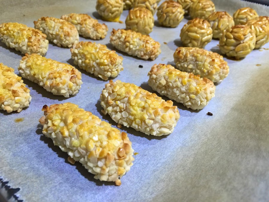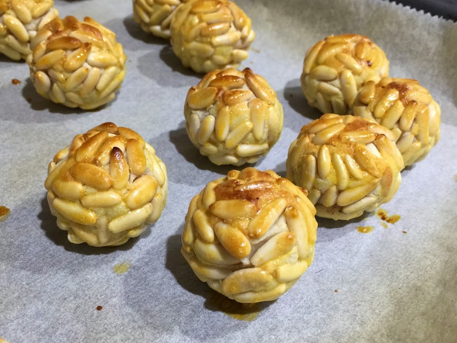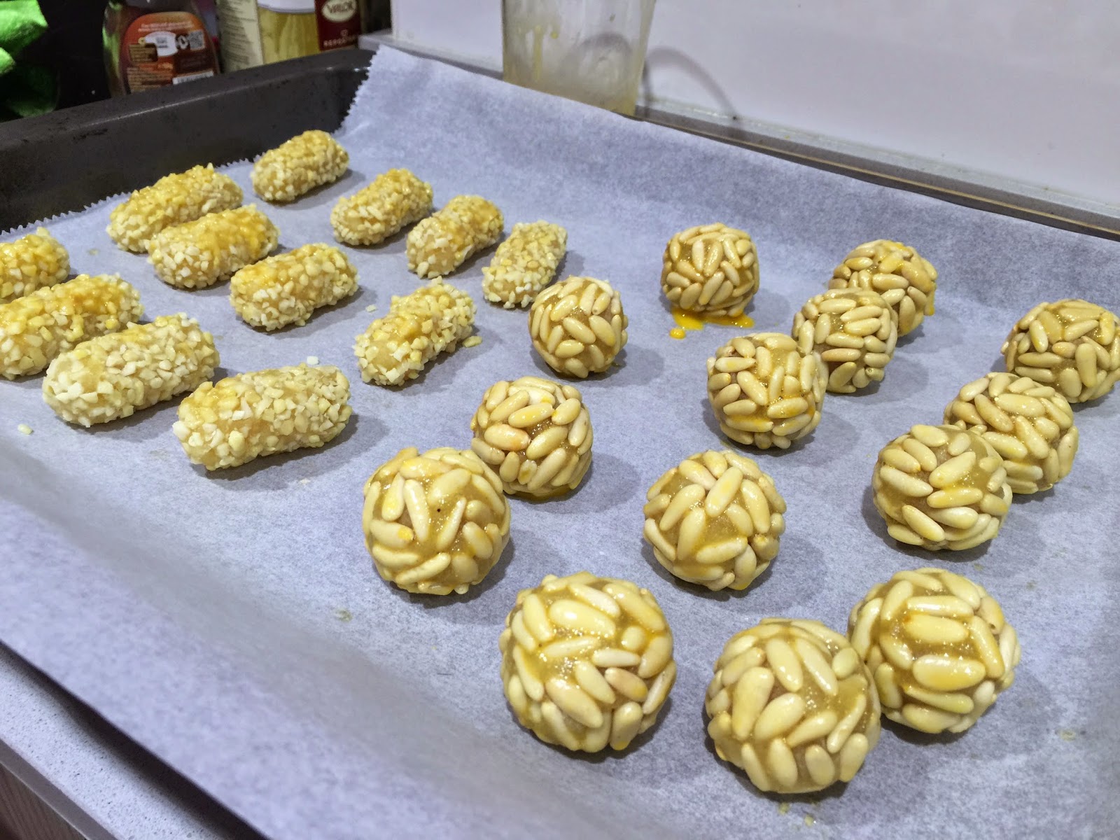 5. Para los de piñones y almendras utilizamos 500g de masa, 250g para cada uno. Dividiremos la masa en porciones de 14g. Los rebozamos en los piñones y las almendras. Para que se adhieran a la masa necesitaran un poquito de presión. Los de piñones con forma redondeada, y los de almendra alargaditos. Ponemos las dos yemas de huevo un bol y añadimos 12 gotitas de agua, batimos bien y pincelamos todos los panellets, no hay que excederse con la yema, solo es para darle un toque de brillo y color. Horneamos entre 6 y 8 minutos a 200ºc. Los podemos hornear juntos. No los dejéis mas tiempo porque corréis el riesgo de que el interior os quede muy reseco. Para los de piñones, es muy importante que el piñón sea de calidad. Piñón español de categoría extra, no os conforméis con el piñón Chino, que no sabe a nada.