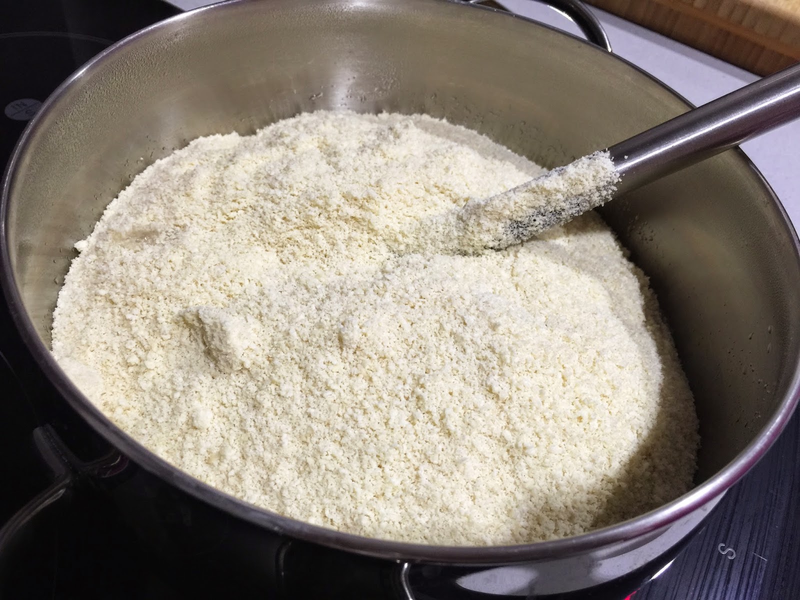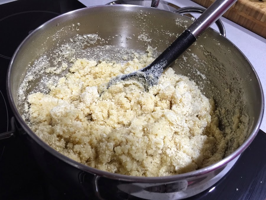 2. Cuando haya espesado un poquito, añadimos los 500g de almendra en polvo. Con una cuchara removeremos, siempre a fuego medio, hasta que la masa se despegue de las paredes de la olla. Con 4 o 5 minutos será suficiente.
