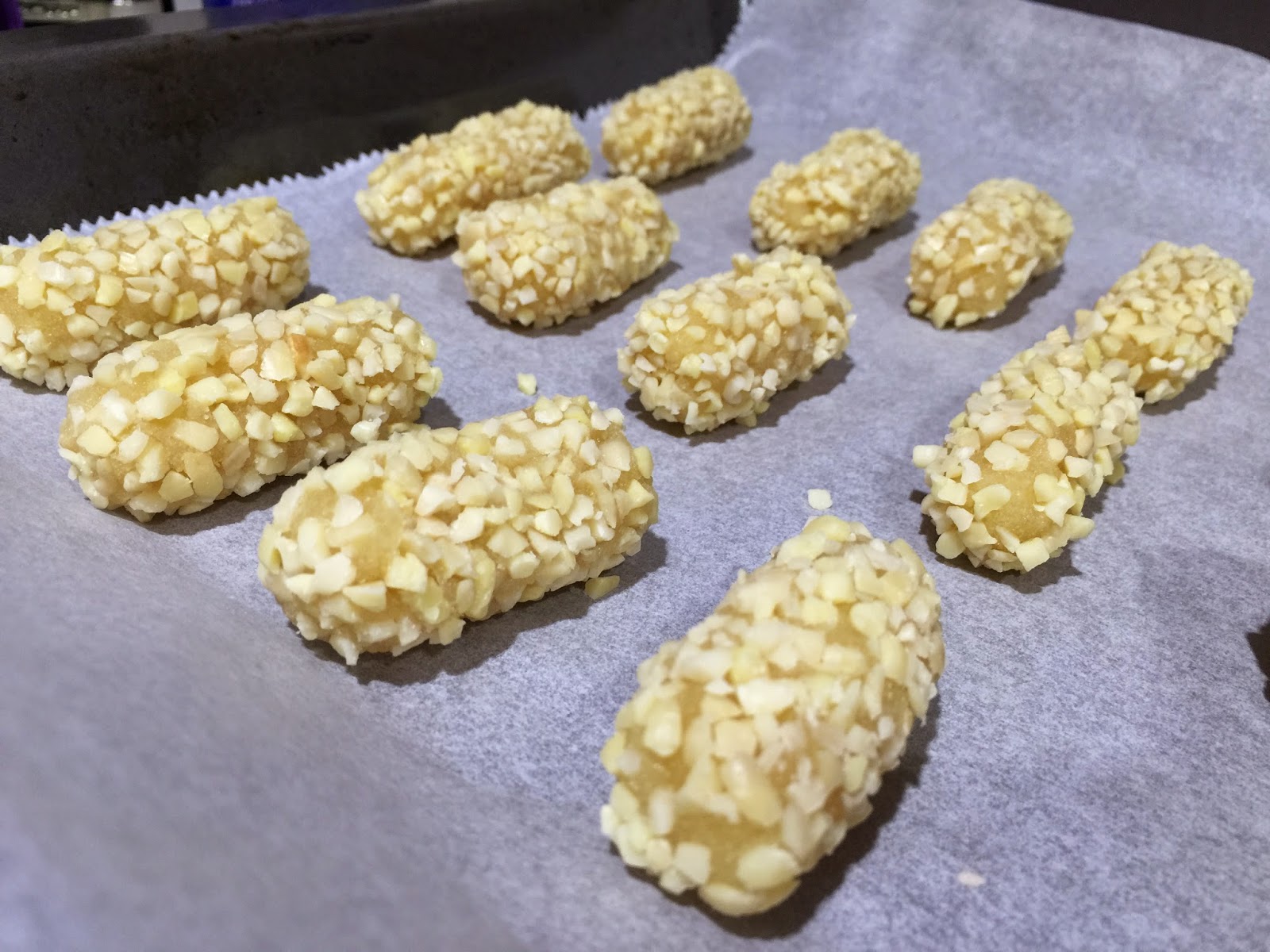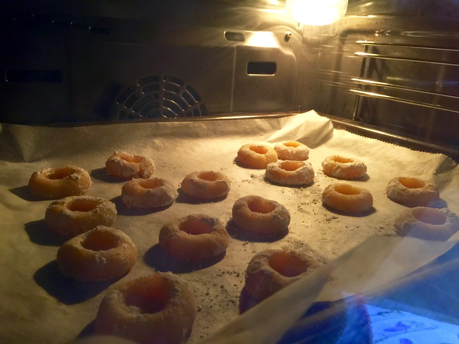 6. Para los de café cogemos una porción de 125g de masa y le añadimos 2 cucharaditas de café soluble. Dividimos la masa en porciones de 18g. Les damos una forma ovalada. Los pasamos por azúcar glas, no hay que pasarse. Con un palillo presionamos en medio para crear la división típica de los granos de café. Yo hice la división vertical, me confundí, lo ideal es hacerla horizontal. Los colocamos en la bandeja de horno con papel de hornear. Horneamos durante 6 minutos a 200ºC. No los dejéis mas tiempo porque corréis el riesgo de que el interior os quede muy reseco. Al sacarlos del horno parecen muy tiernos y delicados, no os preocupéis, en el momento que enfrían endurecen un poco y toman consistencia.