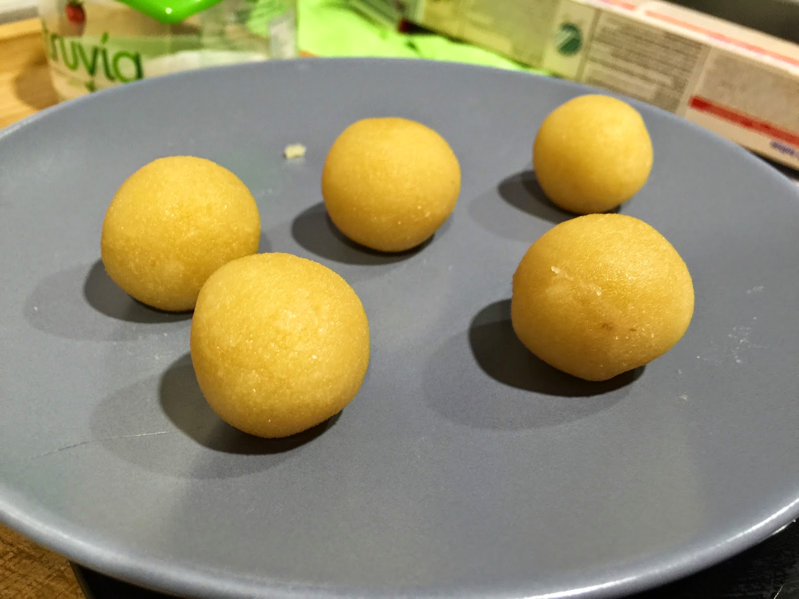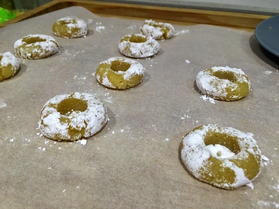9. Para los de limón, cogemos una porción de 125g de masa y le añadimos un poco de ralladura de limón. No hay que pasarse, pensar que solo hay 125g de masa, que se aromatiza con poco. Dividimos la masa en porciones de 16g. Boleamos bien y rebozamos con azúcar glas. Colocamos las bolitas en la bandeja de horno cubierta con papel de horno. Para hacer el agujero central yo utilice la parte superior de un palillero que tengo. Podéis hacerlo con la yema del dedo si no tenéis. Horneamos durante 6 minutos a 200ºC. Al sacarlos del horno parecen muy tiernos y delicados, no os preocupéis, en el momento que enfrían endurecen un poco y toman consistencia. Dejamos enfriar. En el momento de servir cortamos el membrillo a taquitos y rellenamos el hueco central. No hacerlo antes, porque humedecería la masa.