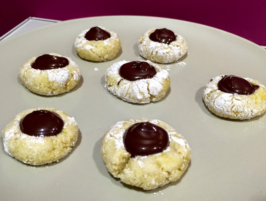 8. Para los de naranja, cogemos una porción de 125g de masa y le añadimos un poco de ralladura de limón. No hay que pasarse, pensar que solo hay 125g de masa, que se aromatiza con poco. Dividimos la masa en porciones de 16g. Boleamos bien y rebozamos con azúcar glas. Colocamos las bolitas en la bandeja de horno cubierta con papel de horno. Para hacer el agujero central yo utilice la parte superior de un palillero que tengo. Podéis hacerlo con la yema del dedo si no tenéis. Horneamos durante 6 minutos a 200ºC. Al sacarlos del horno parecen muy tiernos y delicados, no os preocupéis, en el momento que enfrían endurecen un poco y toman consistencia. Dejamos enfriar. Cuando hayan enfriado, derretimos el chocolate y rellenamos con él el hueco central de los panellets. Dejamos que solidifique el chocolate.