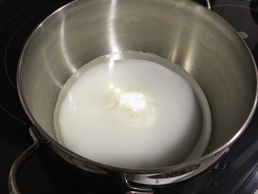 Ponemos en una ollita los 150ml de agua junto con los 270g de azúcar. Ponemos a fuego medio, vamos removiendo hasta que empiece a hervir. Cuando hierva esperaremos un par de minutos hasta que tome consistencia de sirope.