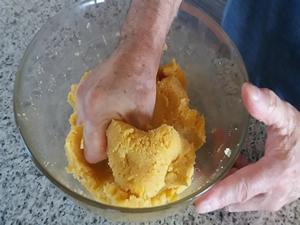Añade el puré de boniato y 1 huevo batido. Amasa bien con las 2 manos, como si estuvieras estrujando la masa (esta maniobra debe durar hasta que casi dejes de notar el azúcar)