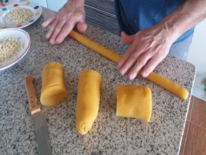 Mientras, haz un cilindro (un rulo) con la masa de unos 6 cm. de diámetro y divide en tantas partes como sabores quieras dar a tus panellets.