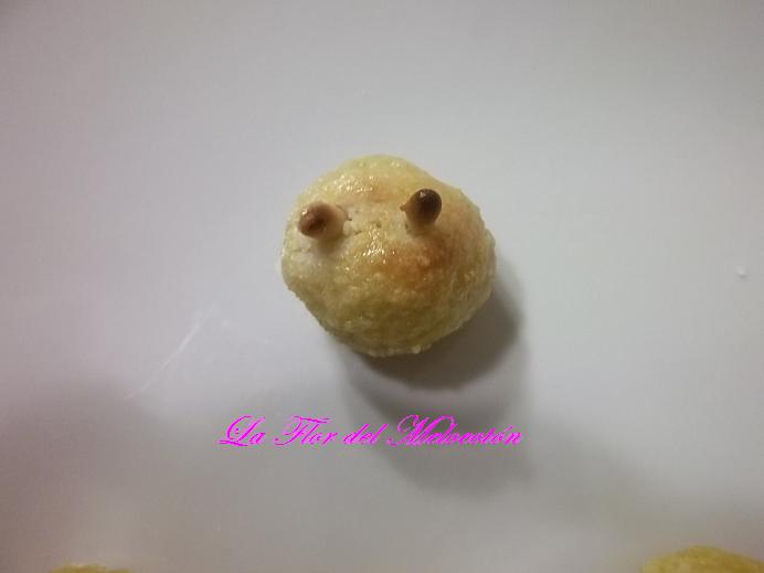 Lo único que hice fue echar unas gotitas de vainilla en la masa de la almendra y darle una forma redondita. Para que no quedarán muy sosos les puse dos piñones y mi hijo rápidamente me dijo que eran unos diablos, jajaja.