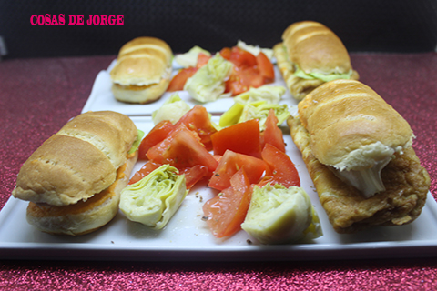 Colocamos dos panecillos en cada plato, acompañamos del tomate troceado y las alcachofas abiertas por la mitad.