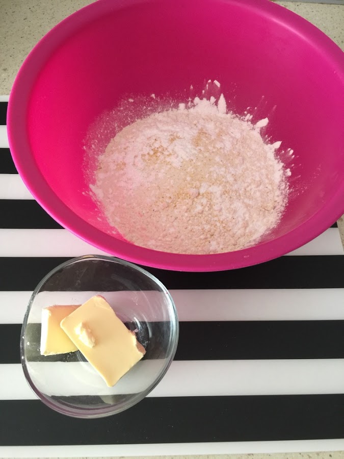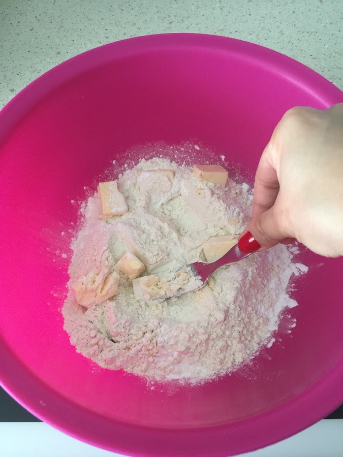 Lo mezclamos un poco y le agregamos la manteca, que tiene que estar semi fria, y la vamos a pisar con un tenedor ( si tienen un cornet tambien pueden usarlo)