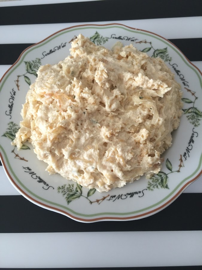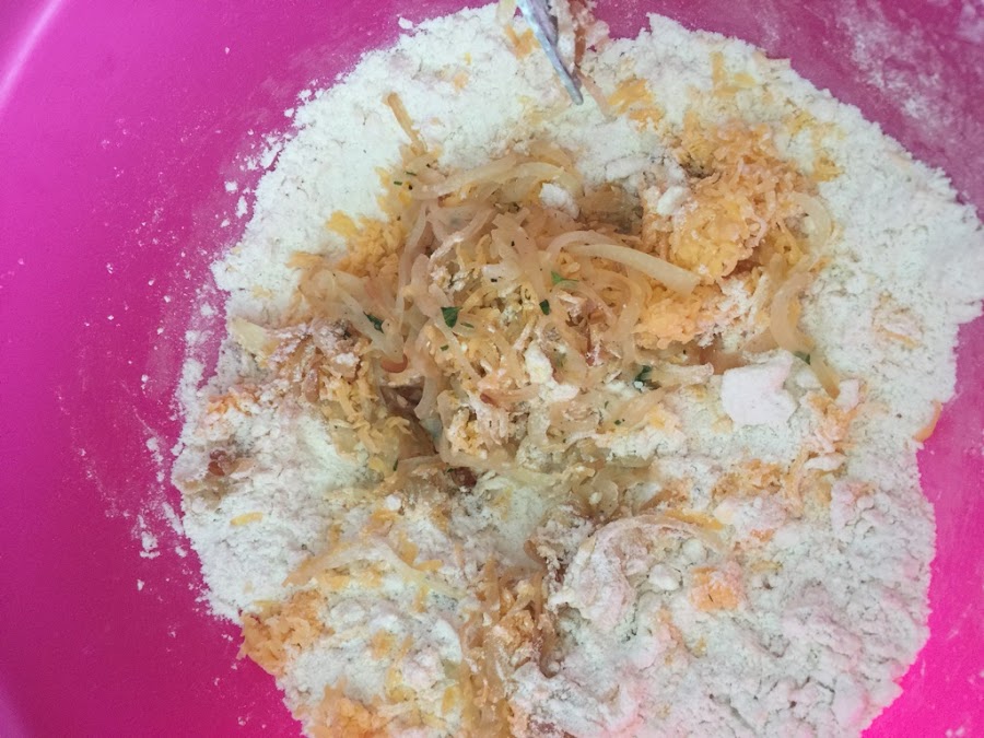 Una vez que esta asi, le vamos a agregar el queso que lo vamos a rallar con un rallador y lo integramos bien, siempre mezclando con un tenedor. Yo en este caso tambien le agregue cebolla. 150 Gr de cebolla picada y dorada previamente.