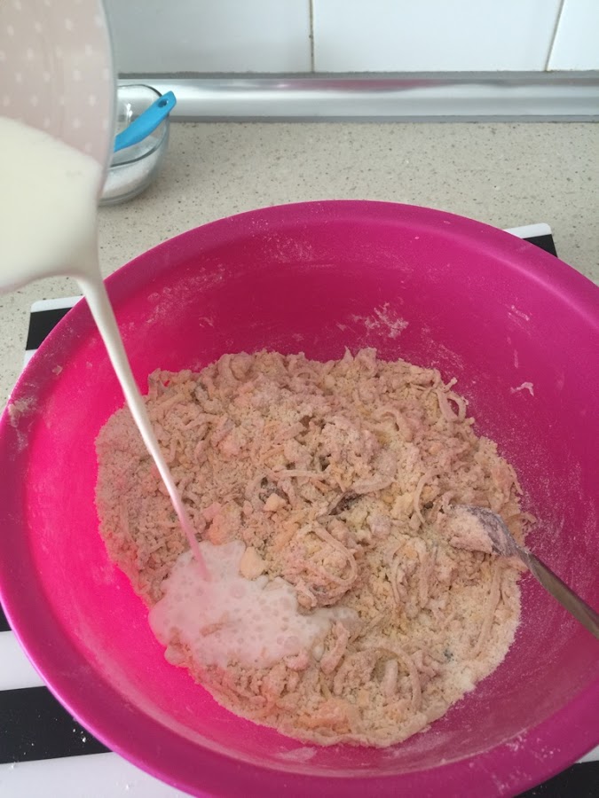 OJO! solo mezclar hasta que este integrado. No lo mezclen mucho, por que de esa manera desarrollariamos el gluten de la harina, y nos quedaria un pan duro.
