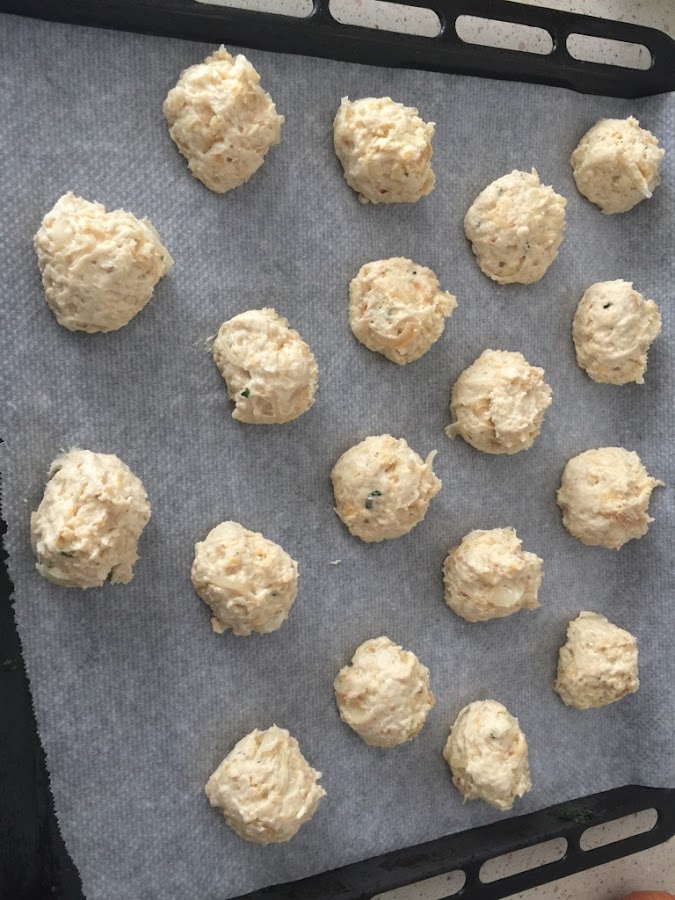 Por ultimo, con dos cucharas o con las manos mismas, hacemos bolitas, todas del mismo tamaño y las colocamos en una placa para horno, con papel manteca.